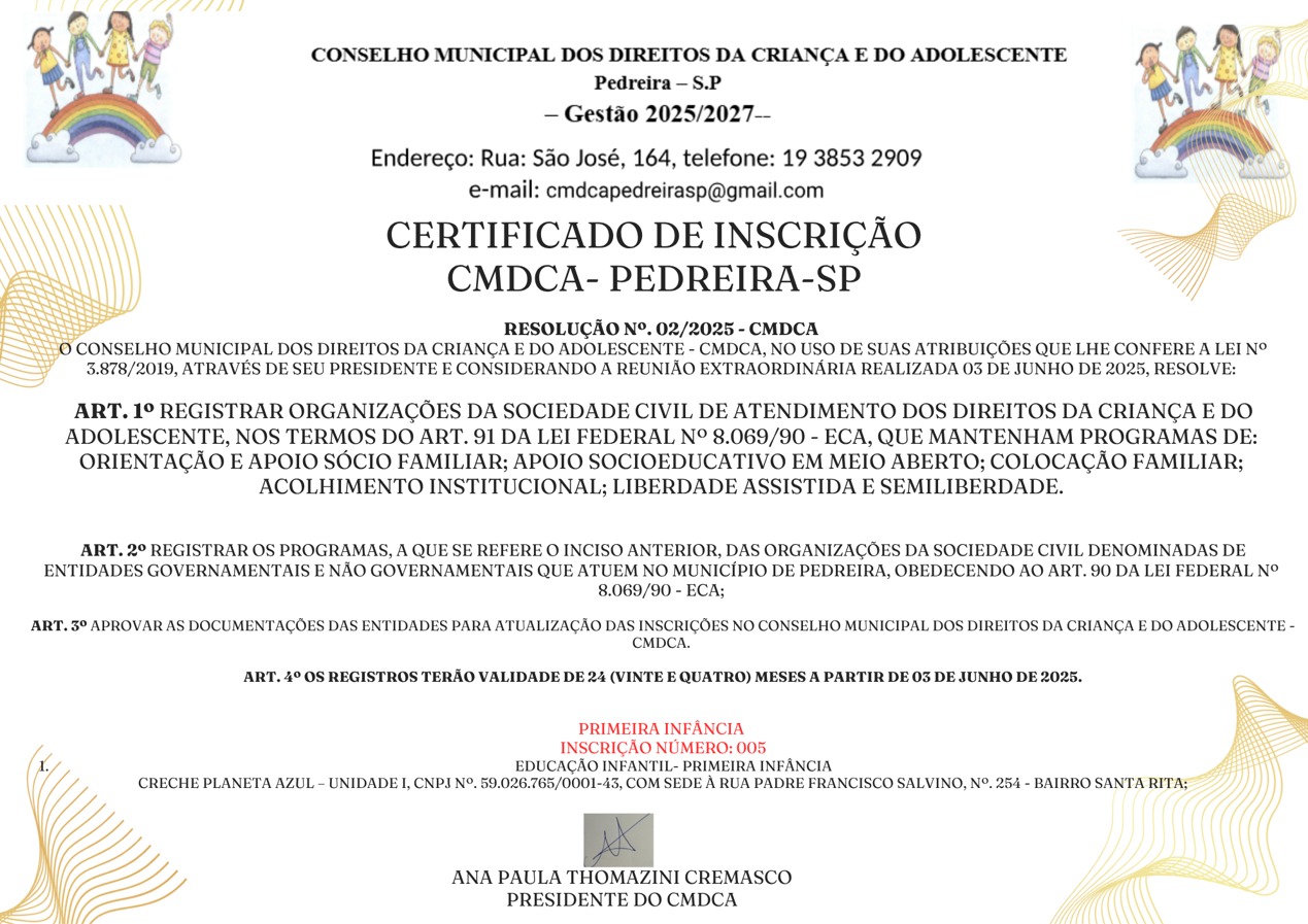 Conselho Municipal dos Direitos da Criança e do Adolescente – Creche Planeta Azul